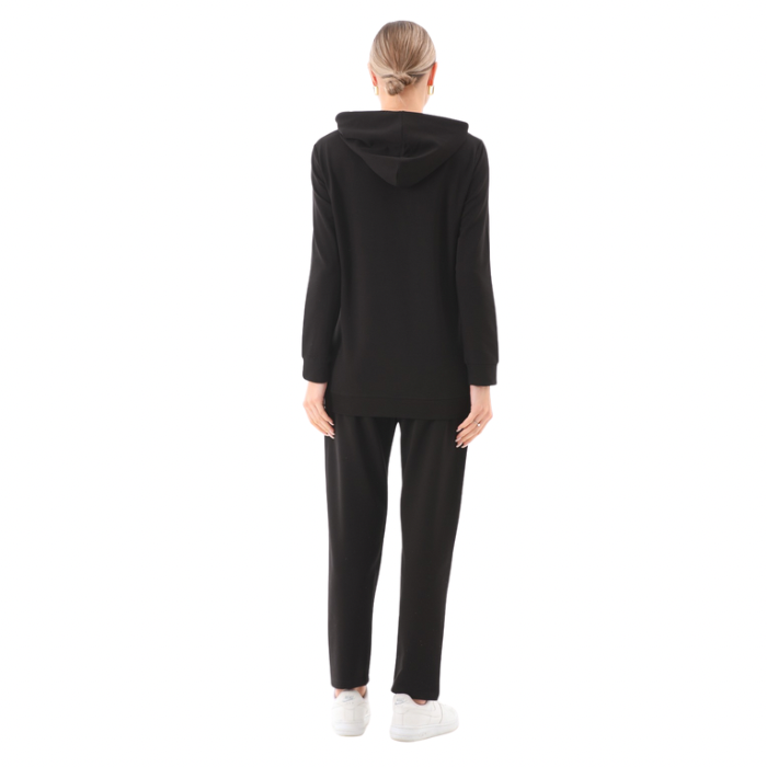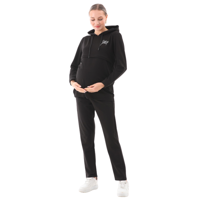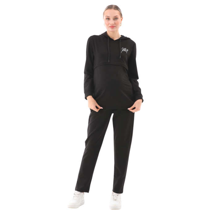 Trudnički komplet trenerke sastoji se od udobnog gornjeg dijela i donjeg dijela s visokim elastičnim pojasom koji nježno podupire trbuh. Izrađen je od mekane, prozračne tkanine koja pruža maksimalnu udobnost kroz sve faze trudnoće. Krojevi su prilagođeni promjenama tijela, bez stezanja i s punom slobodom pokreta. Idealan je za svakodnevno nošenje, šetnje ili odmor kod kuće. Moderan izgled i funkcionalnost čine ovaj komplet savršenim izborom za buduće mame.