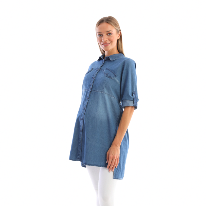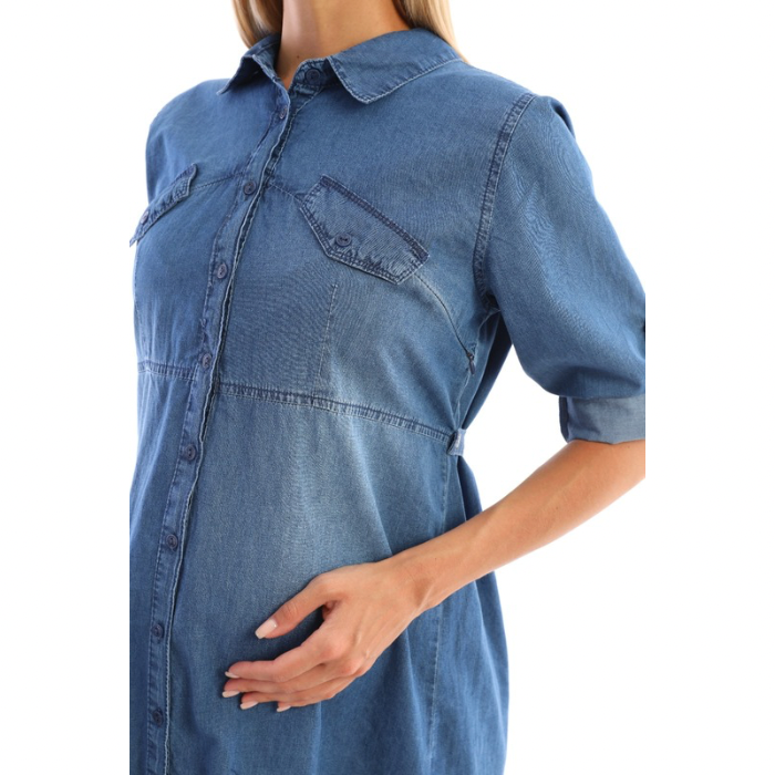 Trudnička haljina izrađena je od mekanog, laganog trapera koji pruža udobnost i slobodu kretanja. Širi kroj i prilagodljiv dizajn savršeno pristaju trudničkom trbuhu. Praktična, moderna i idealna za svakodnevno nošenje u toplijim danima. Spoj ležernog stila i funkcionalnosti.