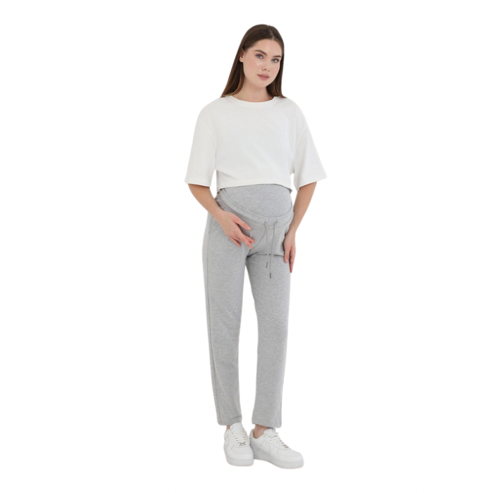 Donji dio trudničke trenerke izrađen je od mekane i elastične tkanine koja se prilagođava rastućem trbuhu. Visoki, udobni pojas pruža laganu potporu bez stezanja i pritiska. Materijal je prozračan, nježan prema koži i idealan za cjelodnevno nošenje. Krojen je tako da omogućava slobodu pokreta i maksimalnu udobnost. Savršen za šetnje, odmor kod kuće ili svakodnevne aktivnosti.